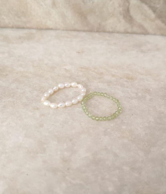 Natural Crystal Stretchy Fresh Water Pearl & Peridot Rings