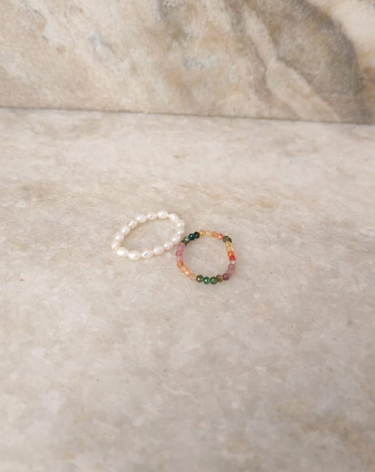 Natural Crystal Stretchy Fresh Water Pearls & Multi Tourmaline Rings