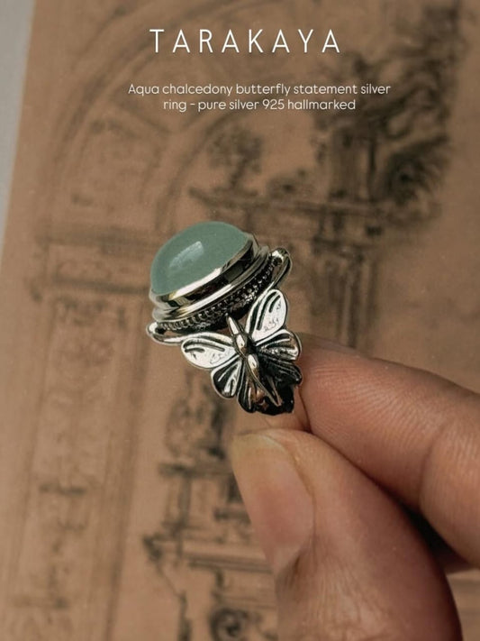 925 Sterling Silver Aqua Chalcedony Butterfly Motif Statement Ring
