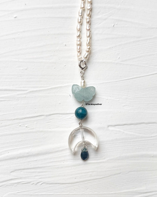 Clear Quartz Crescent Moon, Aquamarine Butterfly & Apatite Round Crystal Handmade Charm 925 Sterling Silver Fresh Water Pearl Necklace