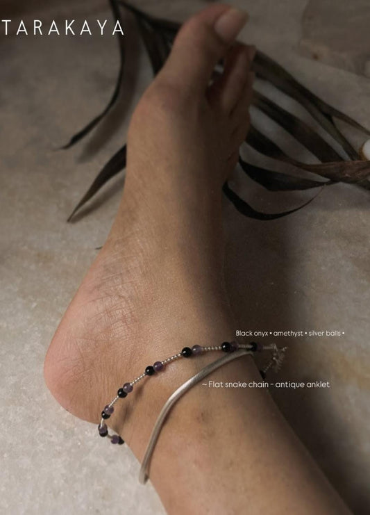 Evil Eye- Black Onyx/ Amethyst 4mm & 2mm Silver Balls 925 Sterling Silver Anklet