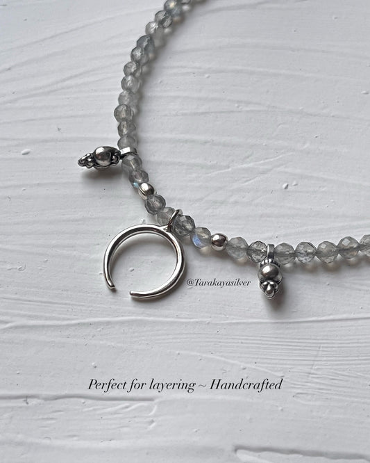 Labradorite 3-4mm Faceted Natural Crystal with Crescent Moon 925 Sterling Silver Boho Necklace