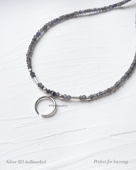 Iolite 3mm Faceted Natural Crystal with Crescent Moon 925 Sterling Silver Boho Necklace