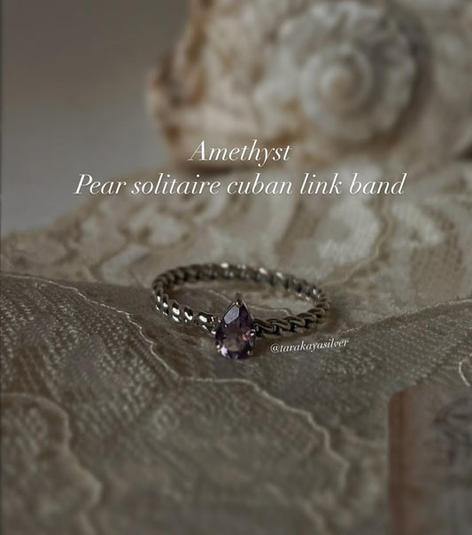 Amethyst Pear Solitaire Cuban Link Band 925 Sterling Silver Ring