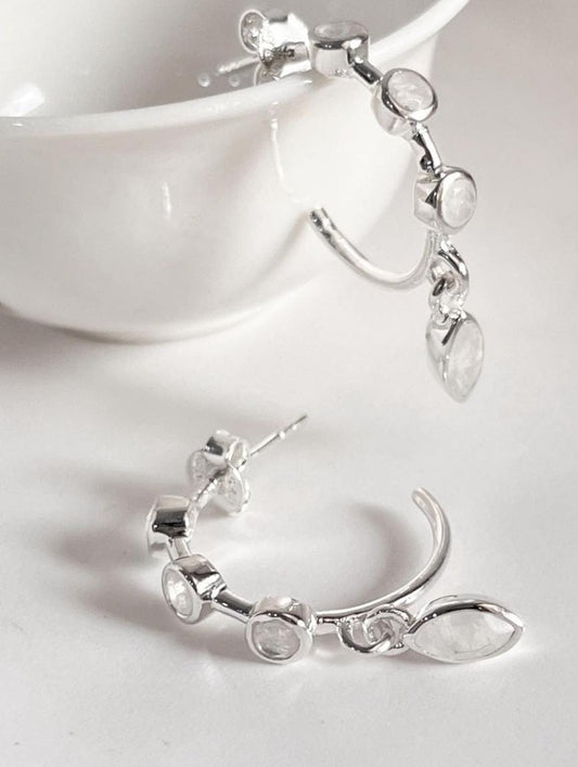 Moonstone Half Hoops Marquise Hanging 925 Sterling Silver Earrings