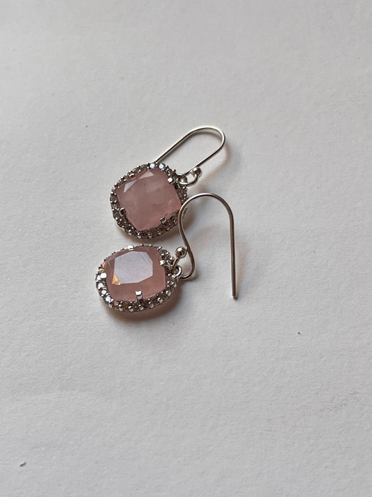 925 Sterling Silver Rose Quartz Cushion Cut Halo Cz Earrings