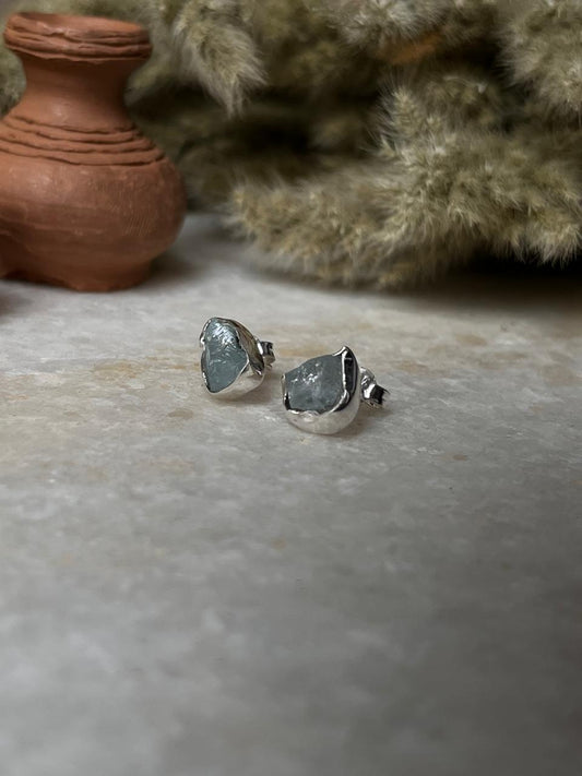 Raw Uncut Aquamarine Studs 925 Sterling Silver Earrings