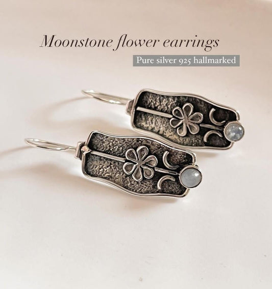 Moonstone Rustic Flower Statement Hook 925 Sterling Silver Earrings