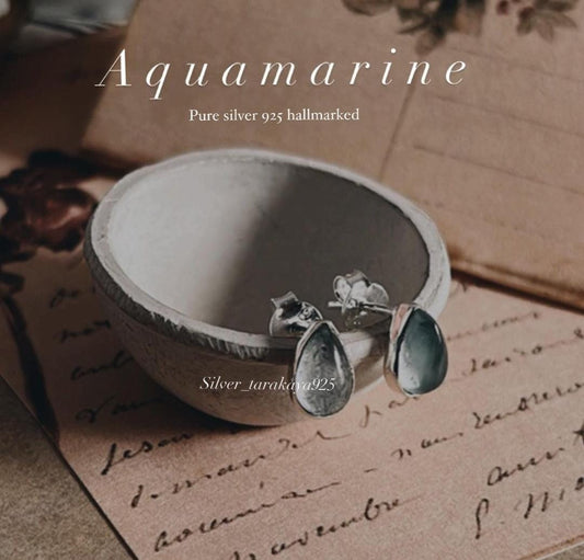 Aquamarine Small Pear Cab studs 925 Sterling Silver Earrings