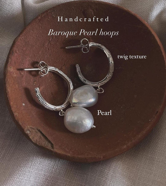 Twig Textured Baroque Pearl Half hoops 925 Sterling Silver Earrings