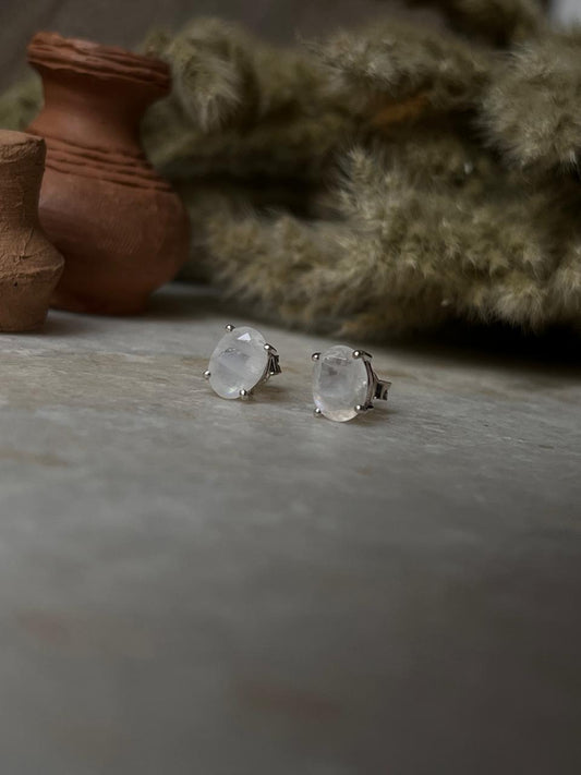 Moonstone Oval Faceted Studs 7MM 925 Sterling Silver Earrings