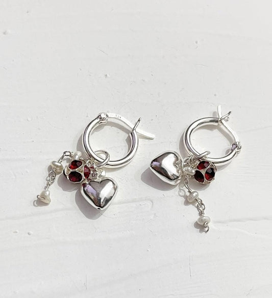 Heart, Red CZ, Pearl Removal Charms 925 Sterling Silver Italian Hoops