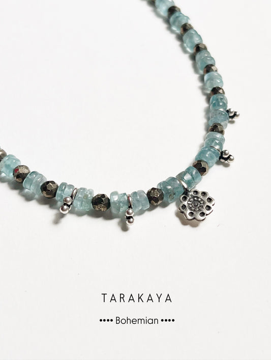 Blue Apatite & Pyrite Silver Charms Boho Choker Handcrafted Sterling Silver 925 Necklace