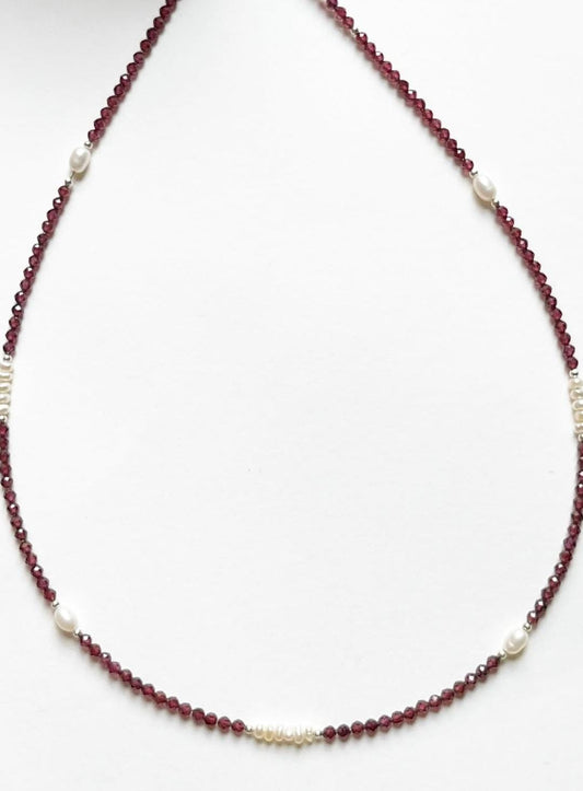 Garnet, Silver Beads & Fresh Water Pearl Boho Choker Handcrafted Sterling Silver 925 Necklace