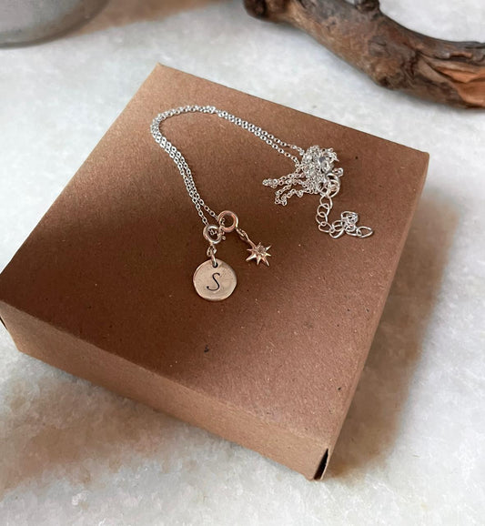 White Topaz North Star & Vintage Font Engraved Initial 925 Sterling Silver Necklace