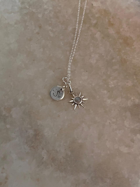 Sunshine Moonstone & Vintage Font Engraved Initial 925 Sterling Silver Necklace
