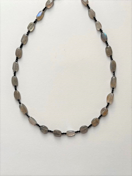 Labradorite Oval & Black Spinel 2mm Natural Crystal 925 Sterling Silver Necklace
