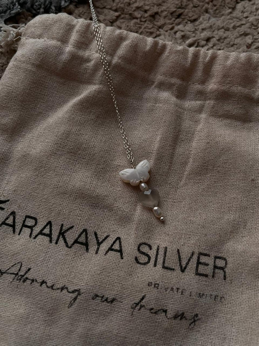 Mother of Pearl Butterfly, Grey Moonstone heart & Fresh Water Pearls Crystal 925 Sterling Silver Neckalce