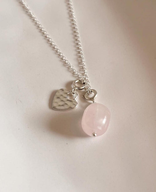 Amethyst Tumble, Rose Quartz Tumble & Hammered Small Heart Charm 925 Sterling Silver Necklace