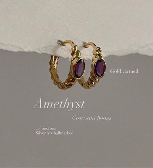 Gold Vermeil Amethyst Croissant Huggies/ Hoops 925 Sterling Silver Earrings