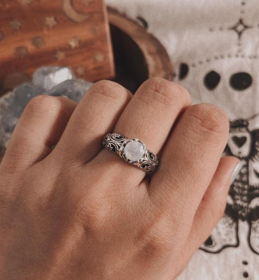 925 Sterling Silver Vintage Motif Moonstone Solitaire Statement Ring