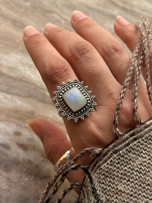 925 Sterling Silver Moonstone Square Rawa Boho Statement Ring