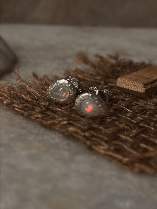Natural Ethiopian Opal Pear Hammered Studs 925 Sterling Silver Earrings