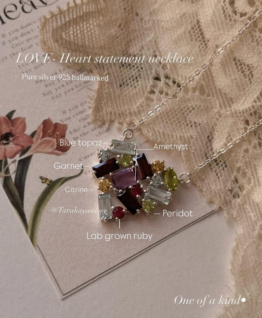 Heart Statement Mix Gemstone Cluster 925 Sterling Silver Necklace