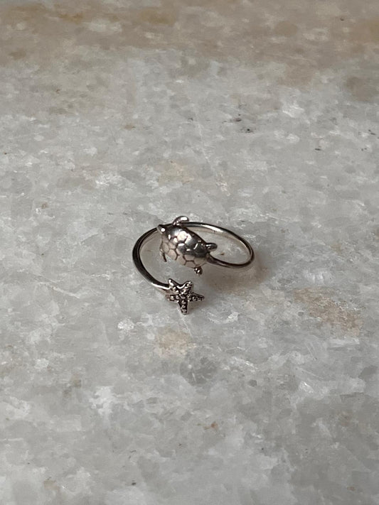 Adjustable Boho Tortoise Starfish 925 Sterling Silver Ring