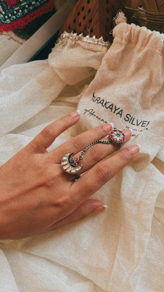 Antique Kundan Meenakari Chand Double 925 Sterling Silver Ring