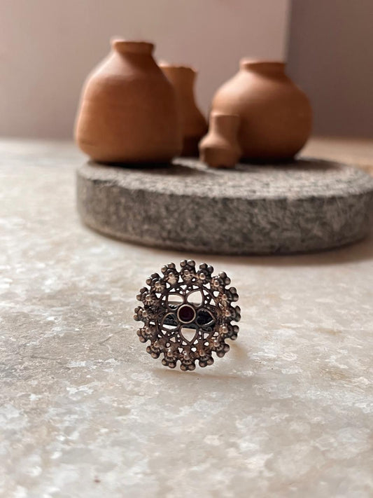 Antique Mandala Flower Kundan 925 Sterling Silver Ring