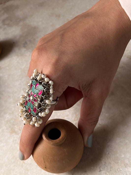 Antique Turquoise Meenakari Kundan Fresh Water Pearls Handcrafted Silver 925 Sterling Adjustable Ring
