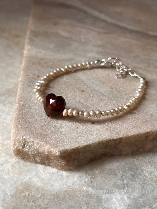 Basra Natural Fresh Water Pearl & Garnet Heart 925 Sterling Silver Bracelet
