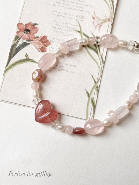 Lovers Dream- Strawberry Quartz Heart, Rose Quartz, Clear Quartz & Pearl Crystal 925 Sterling Silver Bracelet