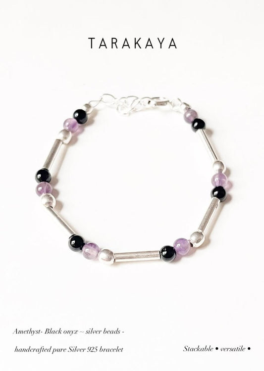 Evil Eye- Black Onyx/ Amethyst 4mm Crystals, & Silver Beads 925 Sterling Silver Bracelet