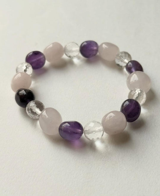 Master Healer Chunky Amethyst Tumble, Rose Quartz Tumble & Clear Quartz Diamond Cut Natural Crystal Bracelet