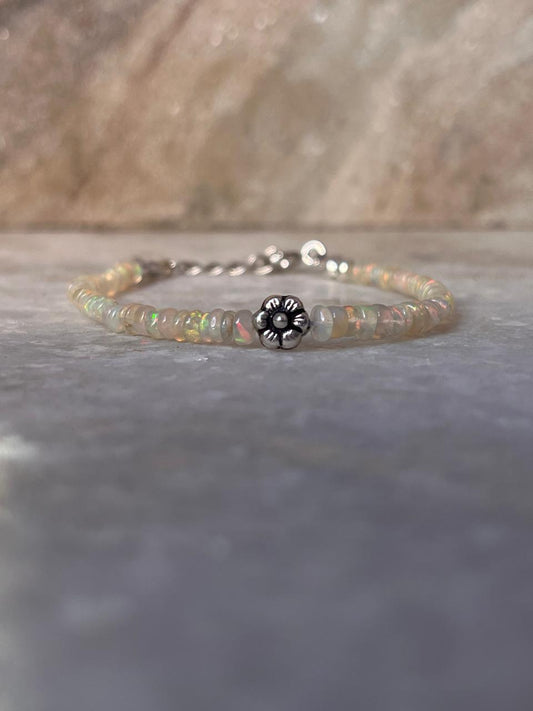 Natural Ethiopian Opal with Floral Charm Handcrafted 925 Sterling Silver Bracelet