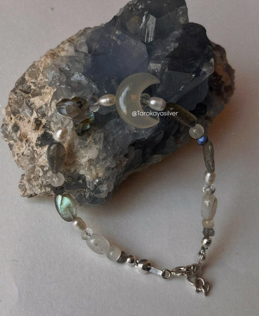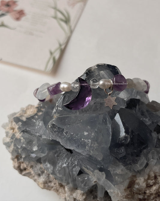 Lunar Radiance - Amethyst Moon & Star Charm Handcrafted Silver 925 Sterling Bracelet