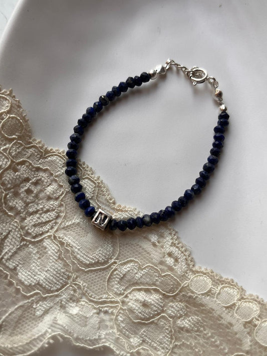 Initial Cube Charm - In Lapis Lazuli Crystal Beads 925 Sterling Silver Bracelet