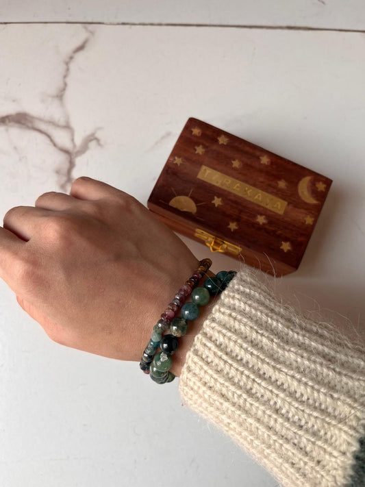 Combo Moss Agate 8mm & Multi Tourmaline 4mm Natural Crystal 925 Sterling Silver Bracelet