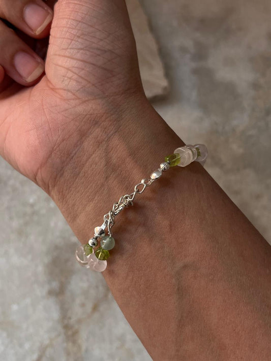 Green Aventurine Carved Leaf , Rose Quartz & Peridot Handcrafted 925 Sterling Silver Bracelet