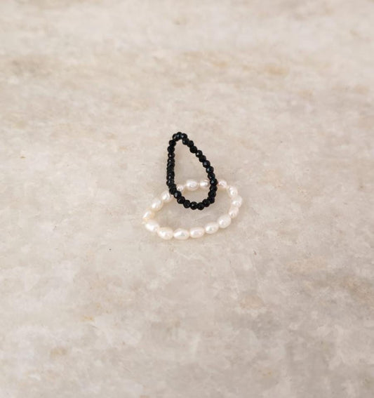 Natural Crystal Stretchy Fresh Water Pearl & Black Spinel Rings