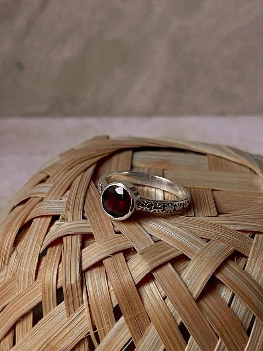 Garnet Solitaire Vintage Engraved Band 925 Sterling Silver Ring