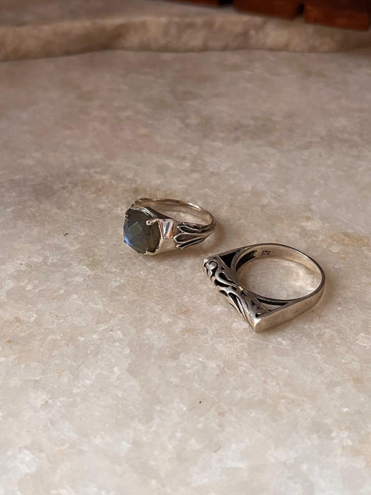 Vintage Motif Fleur Labradorite & Vintage Motif Signet 925 Sterling Silver Stack Set Ring