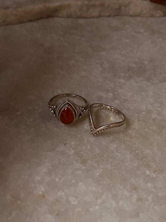Carnelian Pear Boho & V Rawa /Chevron Boho 925 Sterling Silver Stack Set Ring