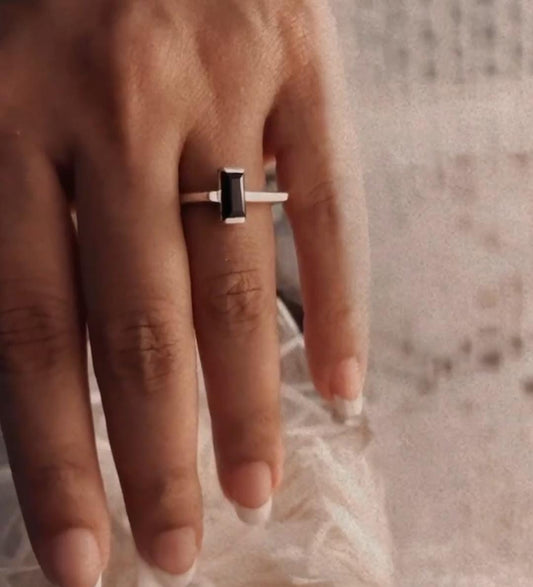 Black Onyx Side Stone Contemporary 925 Sterling Silver Ring