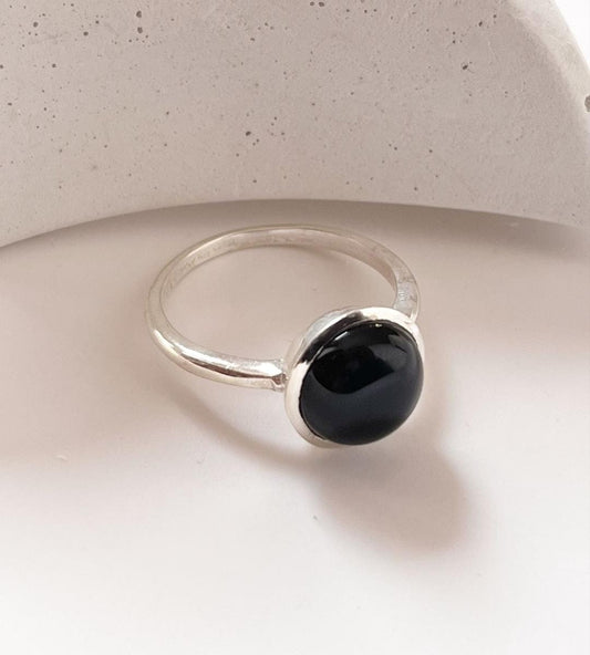Black Onyx Round Plain 925 Sterling Silver Ring