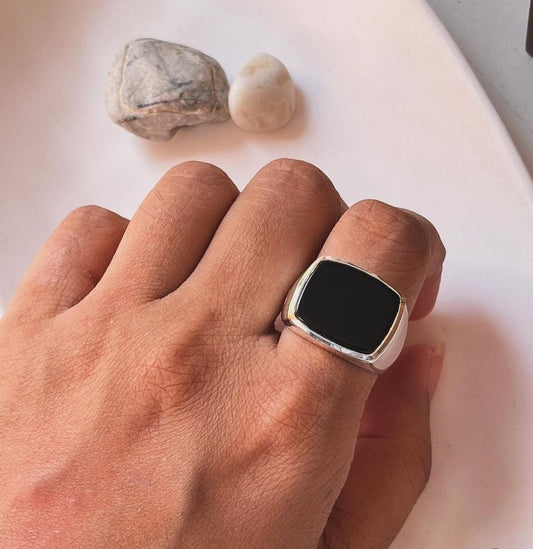 Black Onyx Big Faceted Signet 925 Sterling Silver Ring