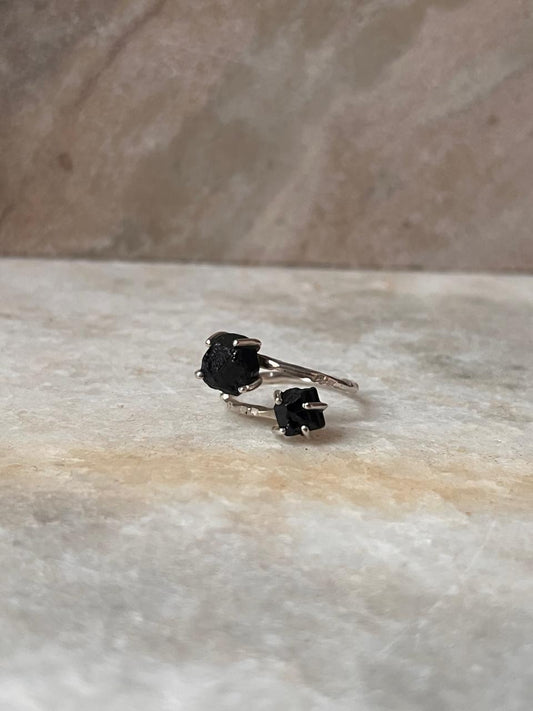 Black Tourmaline Double Raw Uncut Adjustable 925 Sterling Silver Ring