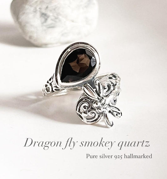 Smokey Quartz Dragonfly 925 Sterling Silver Ring